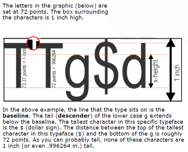 - 72 points (6 picas) ≈ 1 inch (72 points = .996264 inches) - Normally rounded to 72 points = 1 inch